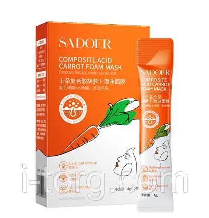 Бульбашкова маска SADOER з екстрактом моркви допоможе зробити шкіру чистою, без чорних точок і запалень. Маска містить екстракт моркви, зволожує, пом'якшує і активно. Гіалуронова кислота; алантоїн; екстракти Моркви, Гамамелісу, Центелі азіатської, Зеленого чаю, Троянди та Ромашки. Такий склад допомагає поліпшити загальний стан шкіри, зволожити шкіру, зменшити почервоніння та чорні крапки, Пружність. Маска глибоко очищає пори і зволожує шкіру, видаляє залишки макіяжу, позбавляє чорних крапок, покращує колір обличчя, надає шкірі гладкість. Спосіб застосування Маска рівномірно наноситься на суху очищену шкіру. бульбашки, можна помасажувати шкіру рухами подушечок пальців, що поплескують. Засіб змивається через 10-15 хвилин. Підходить для всіх типів шкіри. Упаковка 12 штук по 4 грами.